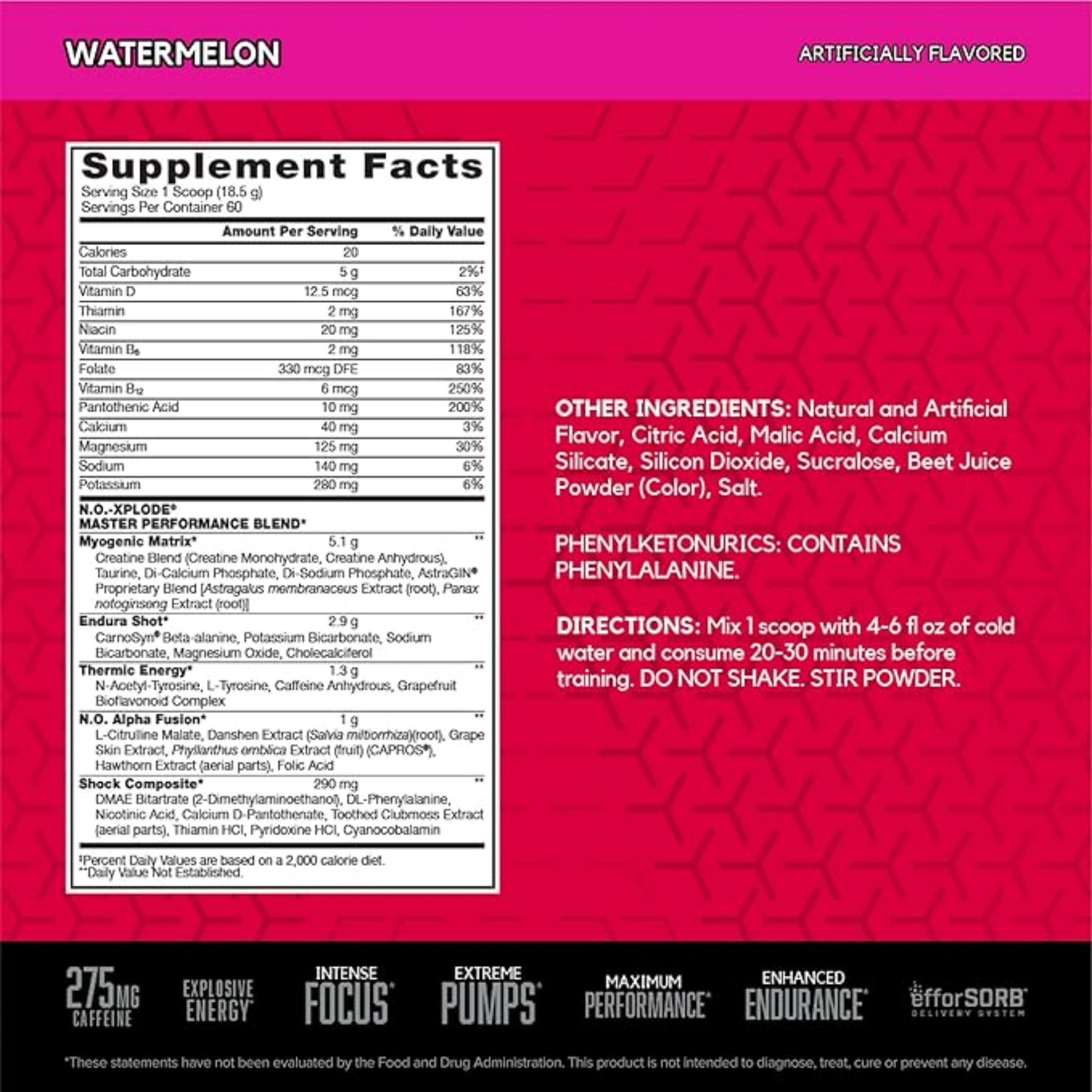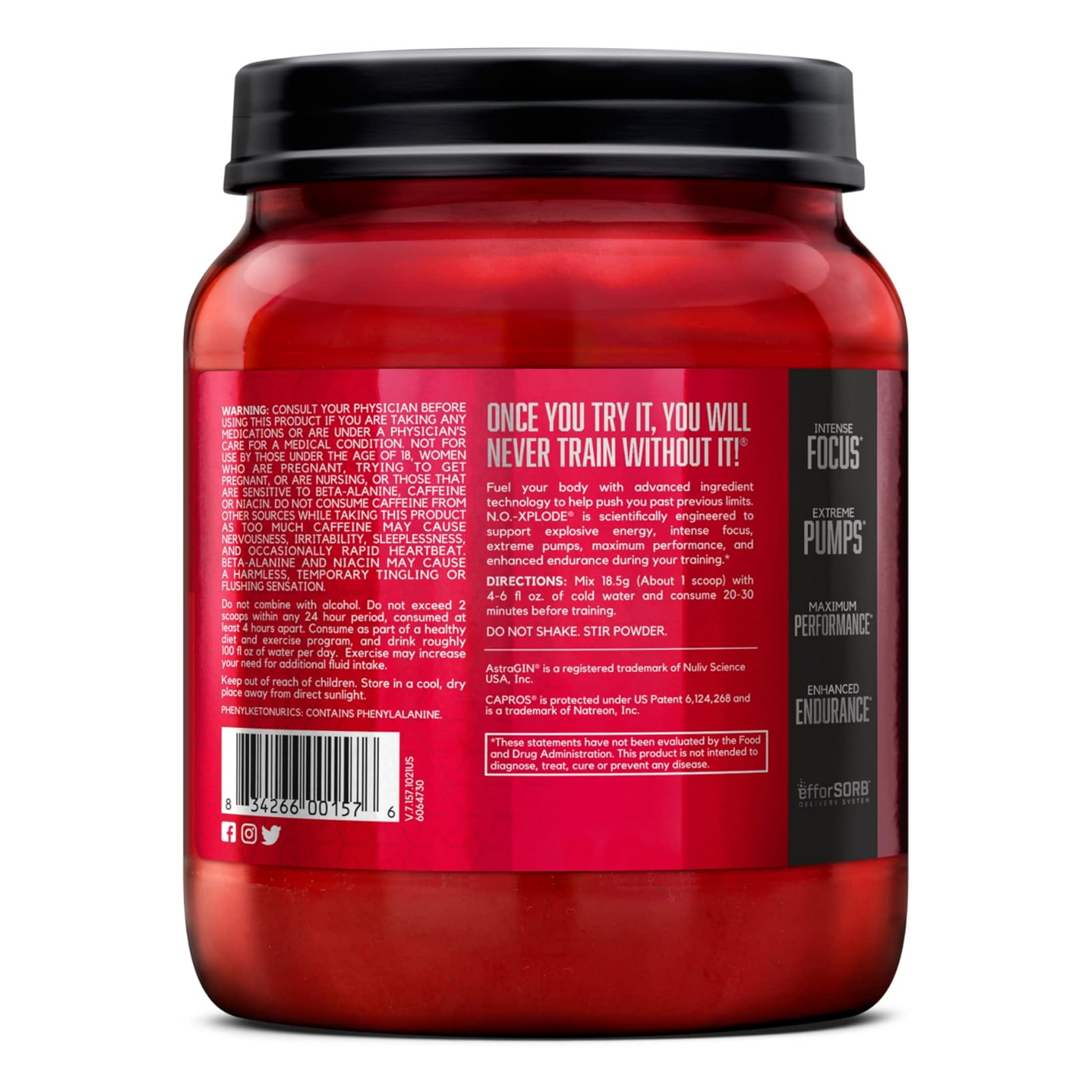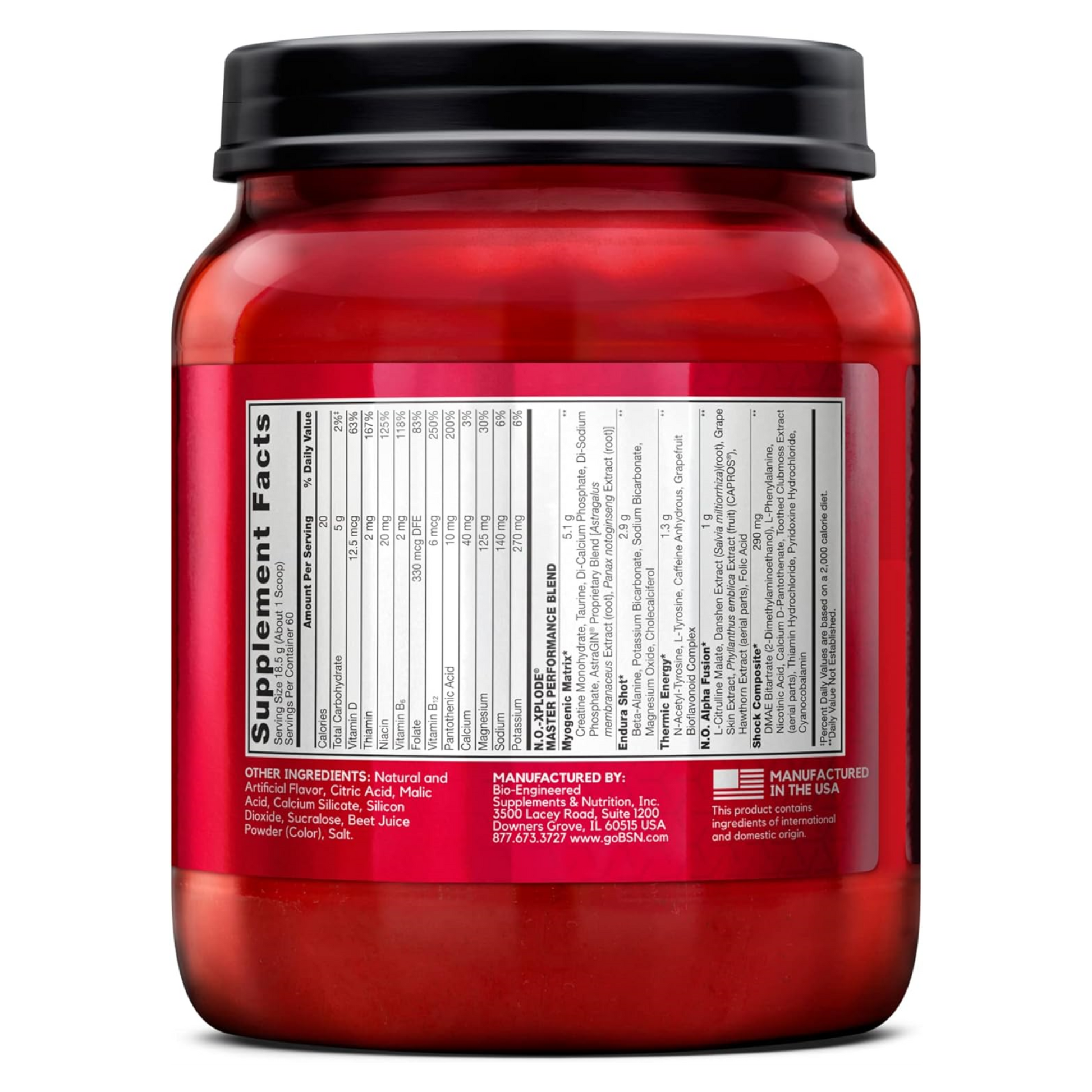 NO-XPLODE es la fórmula legendaria de BSN® diseñada para aportar energía explosiva, concentración y rendimiento. Con 275 mg de cafeína y 1.8 g de beta-alanina por porción, te ayuda a entrenar más fuerte y durante más tiempo.